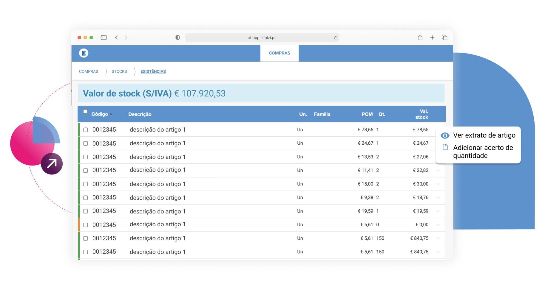 • Efetue correções ao stock através de acertos em quantidade ou valor